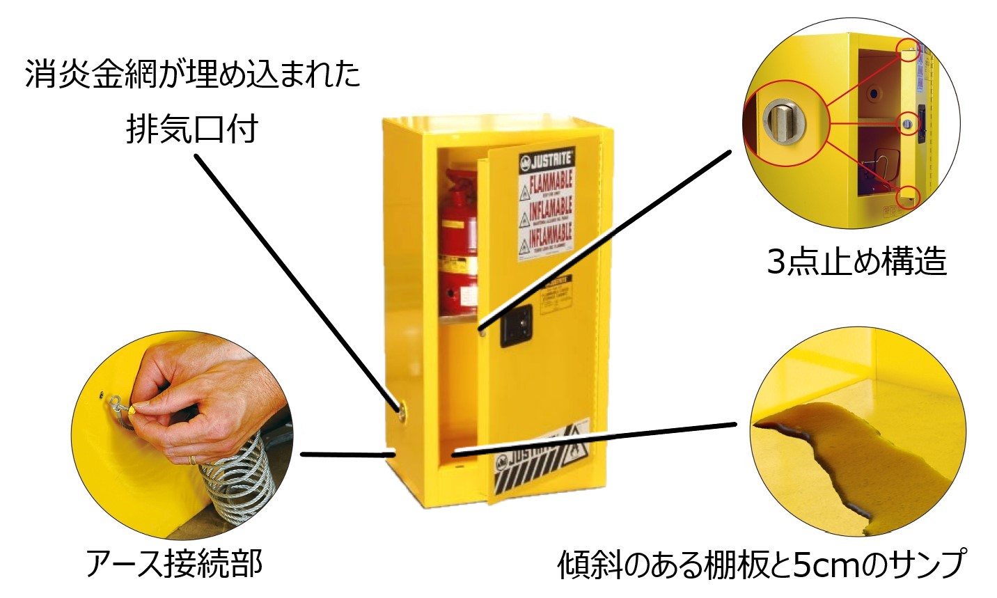 側面の上部と底部の2箇所に、消炎金網が埋め込まれた排気口が溶接されています。静電気などでの火災を防ぐ為のアースコードを繋げられます。(アースコードはオプションです。)内部は深さ約5cmのサンプつきで、棚板は傾斜がついているのでキャビネット外への液体流失を防ぎます。