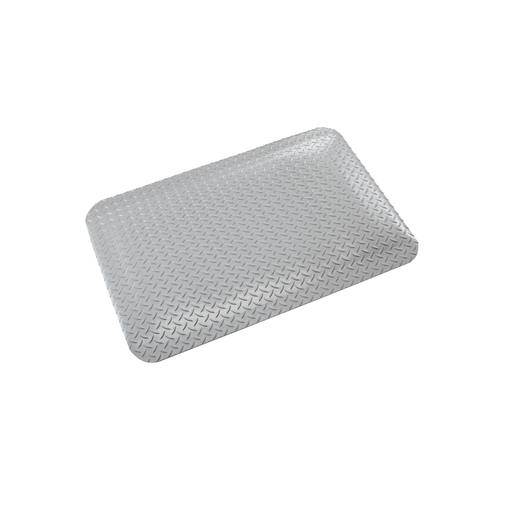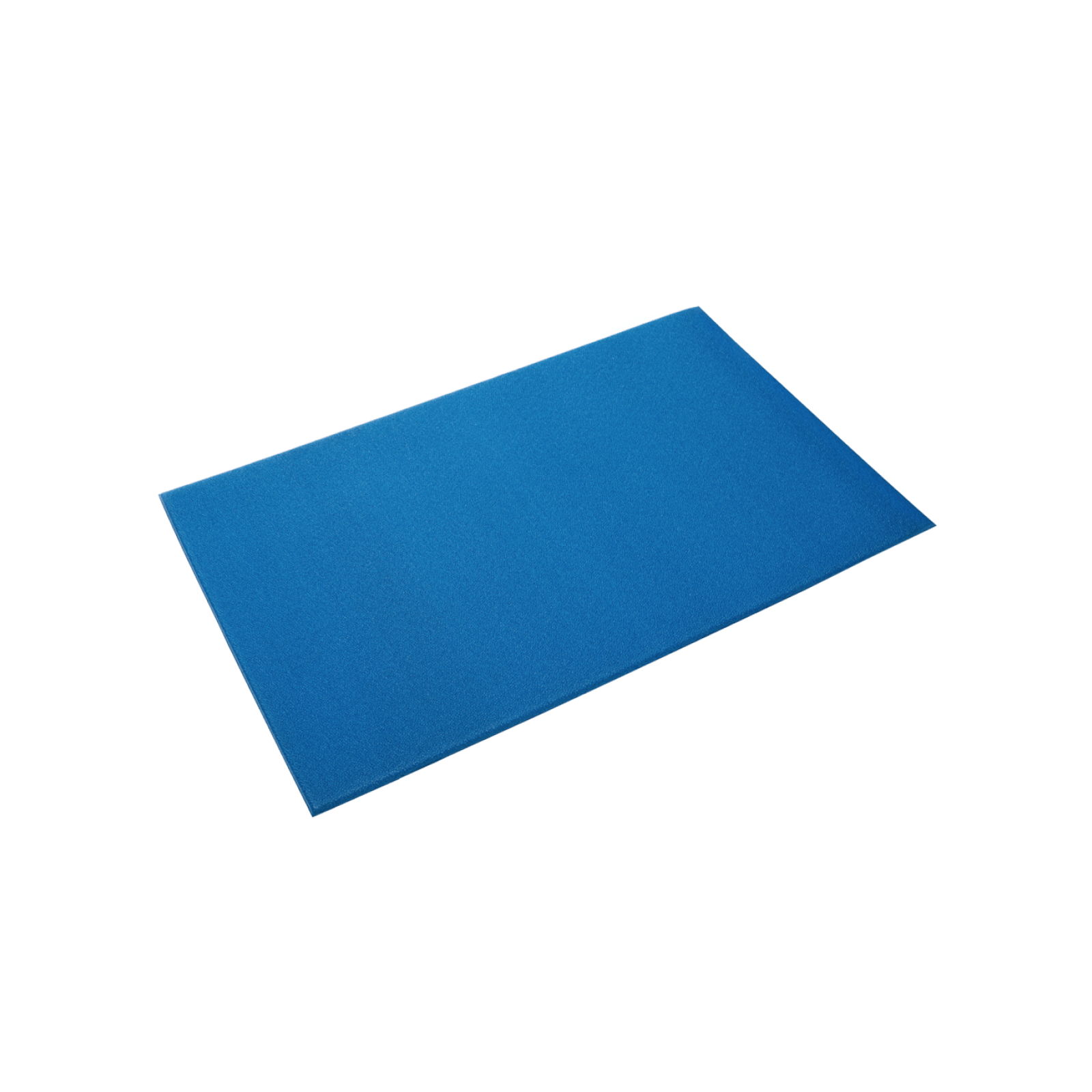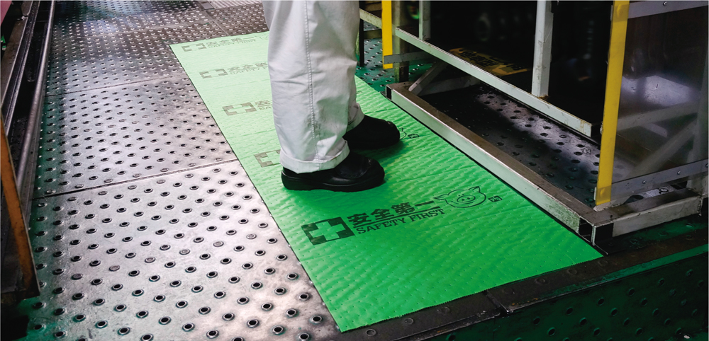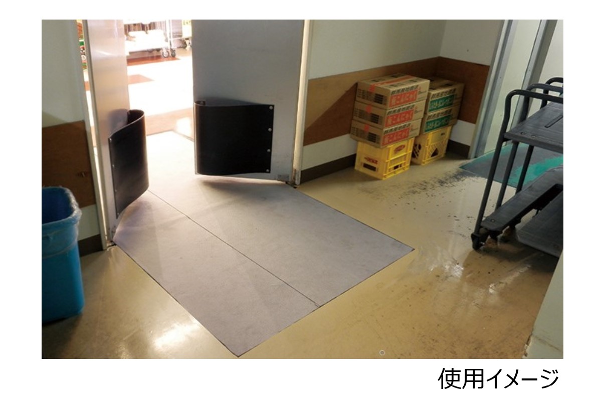 表面は、耐久性に優れたスパンボンド不織布で、裏面は、ずれない特殊な粘着素材です。油、冷却水、溶剤、水を吸収します。全米フロア安全管理協会認定製品です。