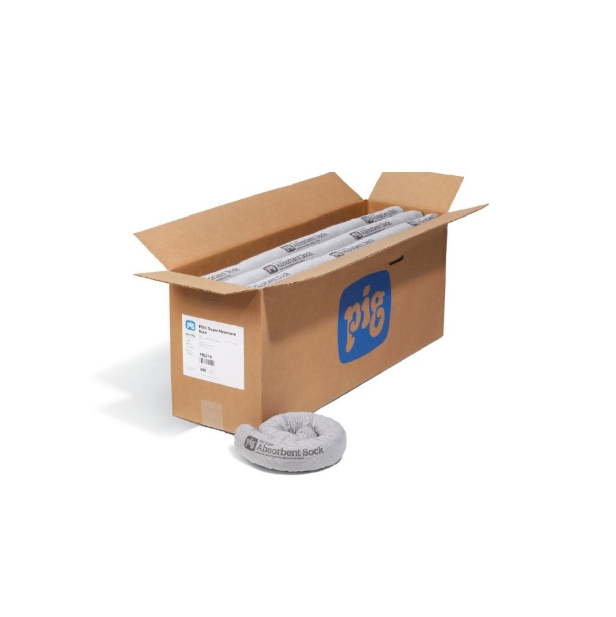 スーパーピグソックスは、油、冷却水、溶剤、水などを吸収します。素材は、吸収性の高いリサイクルセルロース、外側のカバーはポリプロピレン製で破れにくく、吸収した液体を保持します。1本で約3.8Lも吸収するので、他のソックスに比べ多量の液体吸収が可能で、交換頻度も少なくなり、経済的かつ効率的です。