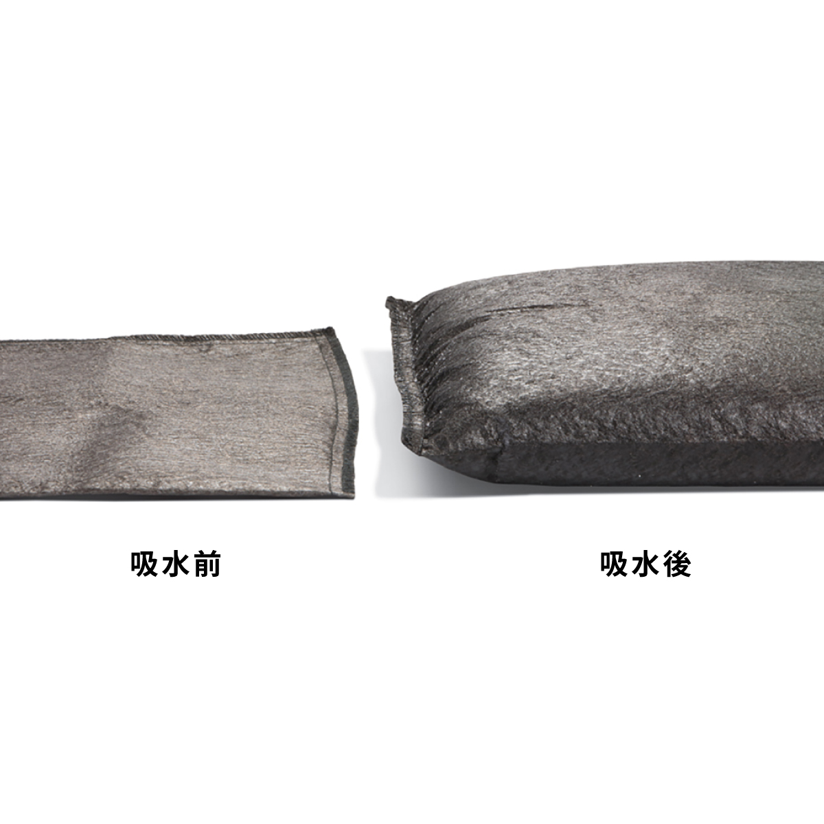 吸水前はコンパクトで軽量なので、緊急対策用の備蓄に向いています。 使用時は、容器にピグ水のう1個につき約20Lの水を入れ、手でもみほぐしながら吸水させます。 吸水させるとおよそ5分ほどで膨らみます。