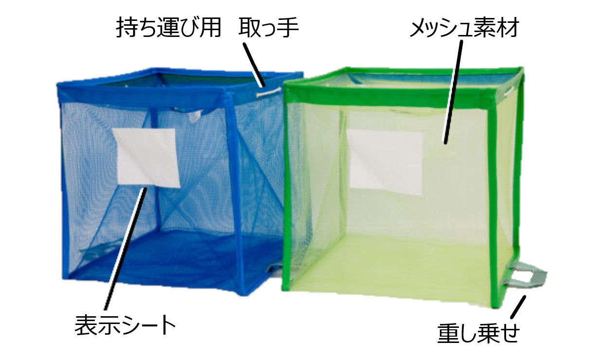 メッシュ形状で中身が確認できる為、特定の収集物以外のゴミは入れにくく、分別収集しやすくなります。名入れや分別に便利な表示シート付きで、本体底部には重し乗せがついている為、風で飛ばされる心配もありません。持ち運び用の取っ手もついているため容易に管理することができます。