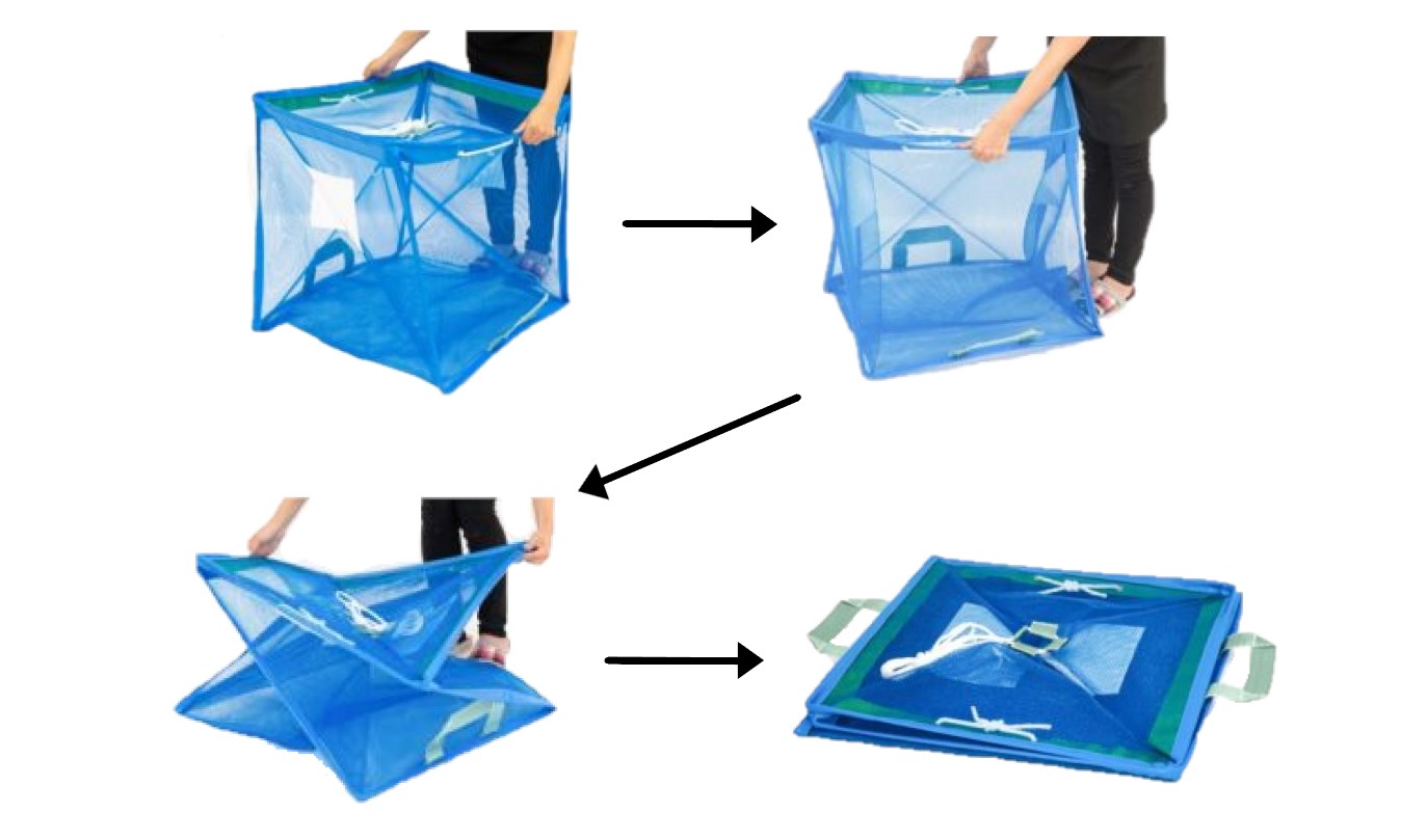 | ツイストボックス 90角 | 【型番】90角 【外寸】W90×D90×H90cm 【本体色】ブルー/グリーン 【材質】 ネット再生PET 支柱:FRP 枠:ポリエチレン 【容量】約720L 【出荷単位】1 【仕様】折りたたみ式 |
