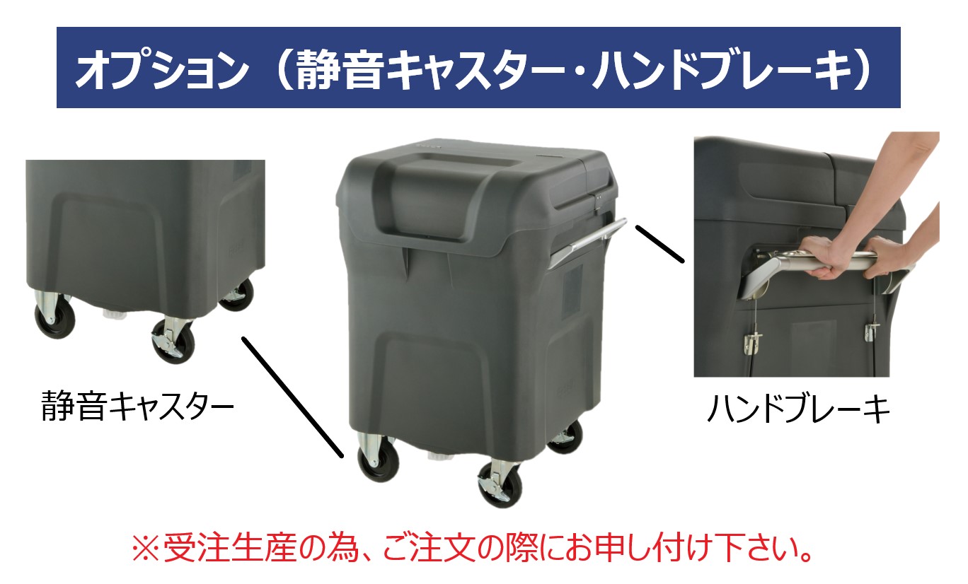 • オプションの静音キャスターは、走行時に発生する騒音を軽減するので病院など様々な場所でお使いいただけます。ハンドブレーキは、バーを握るとブレーキが解除される安全設計を採用しています。