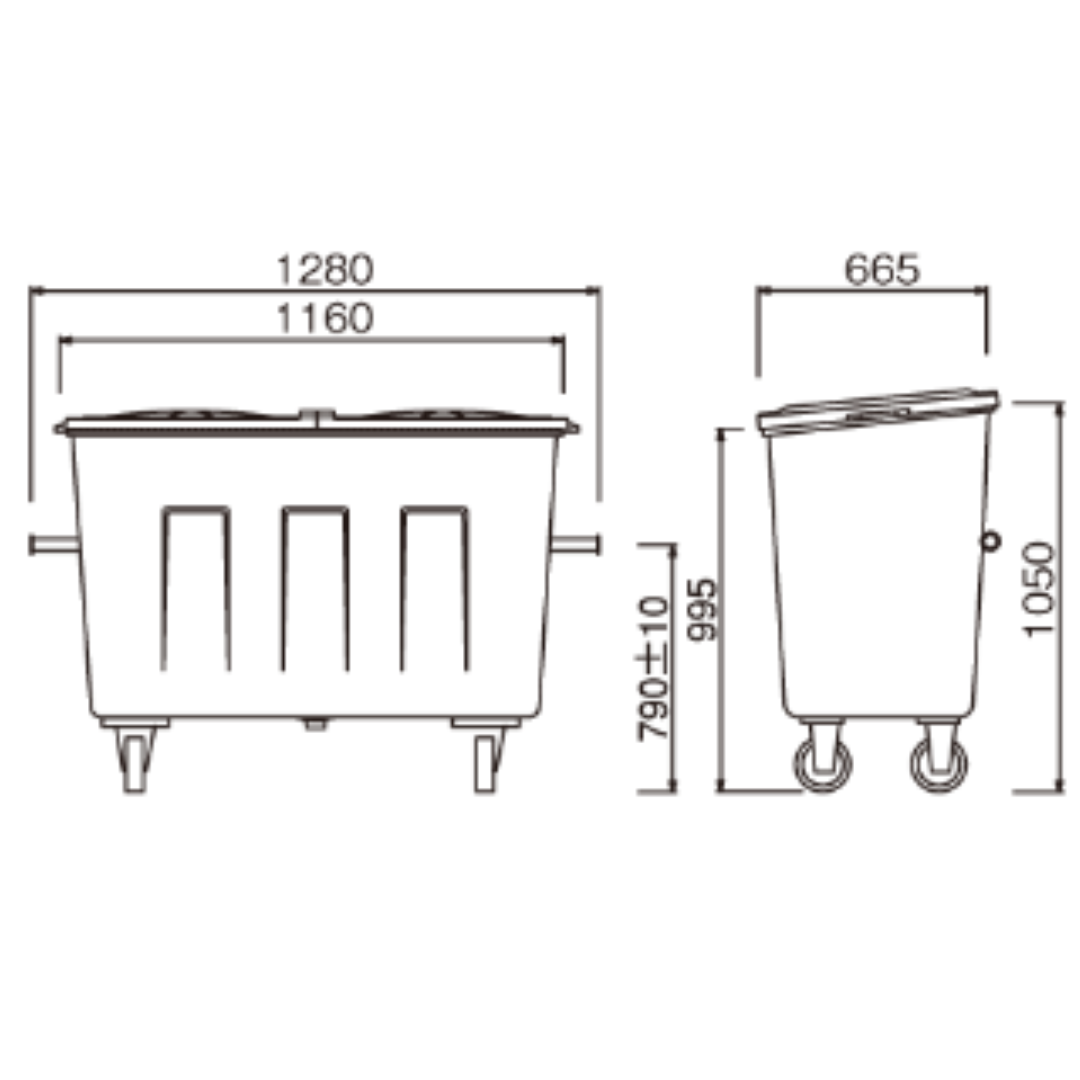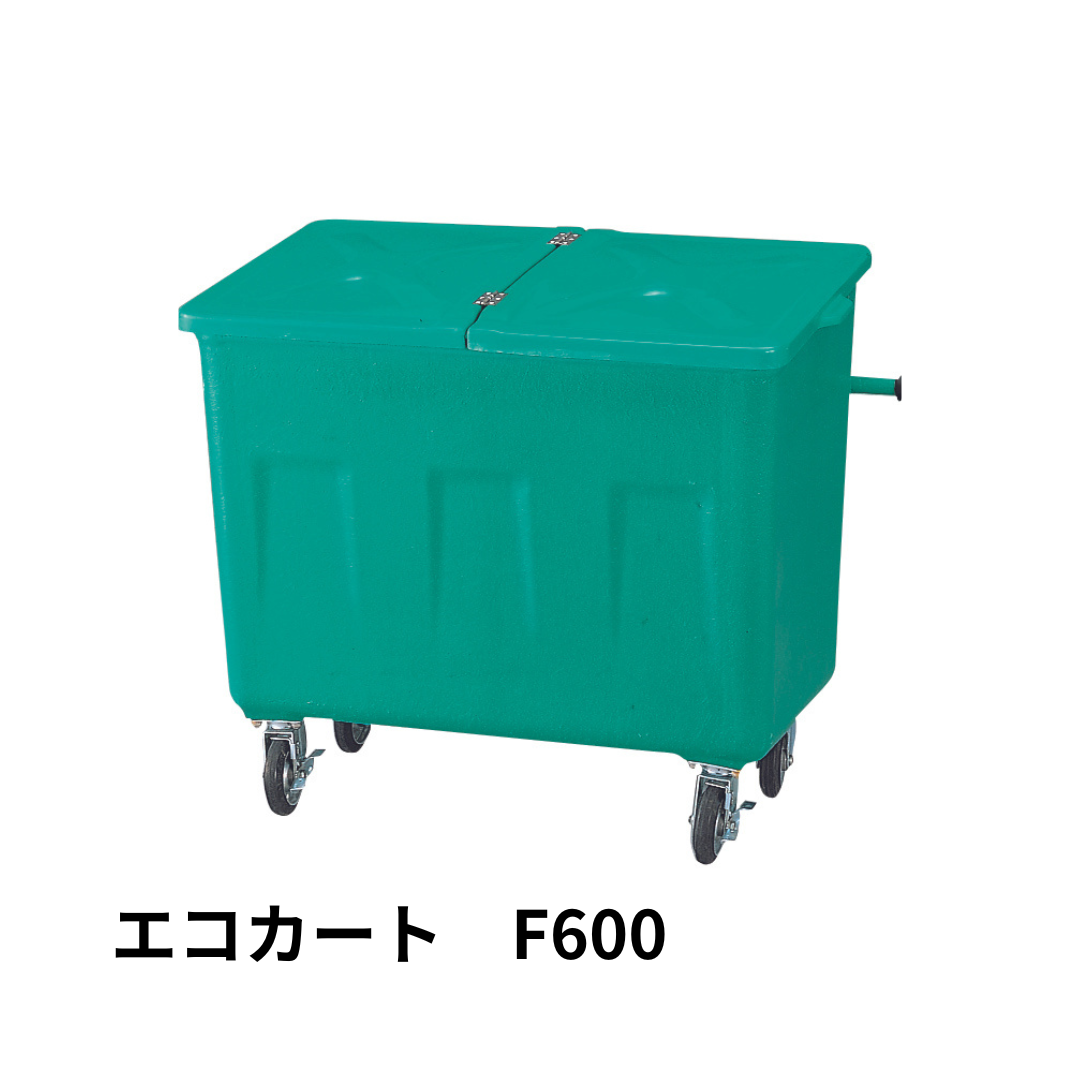 | エコカートF600 | 【型番】P600(本体) P600F(フタ) 【本体外寸】本体(フタなし):1160×665×1050m バー:1280×790 【容量】約600L(45Lゴミ袋13個相当) 【重量】42kg 【材質】FRP 【標準色】グリーン 【仕様】キャスター:Φ150mm(自在キャスター2ヶ、ストッパー付自在キャスター2ヶ) |