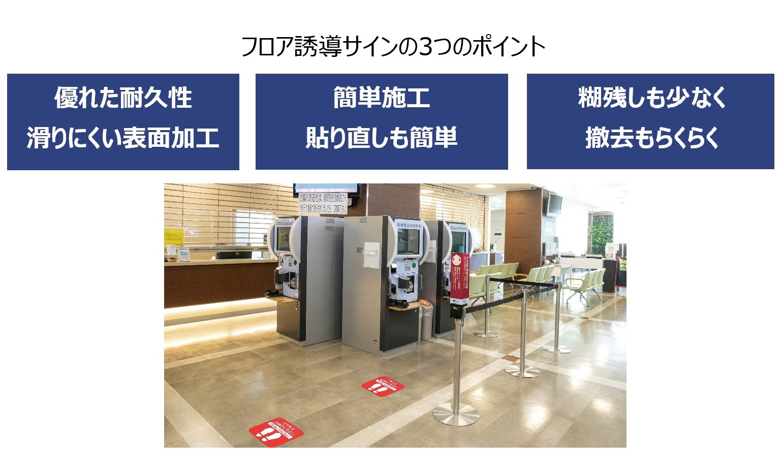 • フロア誘導サインは使用者のことを考え、使いやすさを追求した感染対策予防商品です。※凹凸のある面や床材の種類によっては貼れない場合があります。