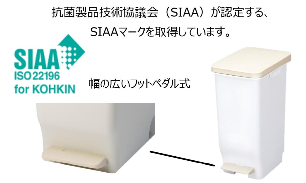 • 銀イオンAg+を練り込んだ抗菌加工で細菌の繁殖を抑制する足踏み式のゴミ箱です。SIAAマークは、ISO22196法により評価された結果に基づき、抗菌製品技術協会ガイドライン品質管理・情報公開された製品に表示されています。