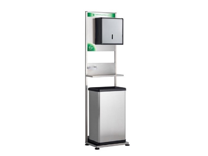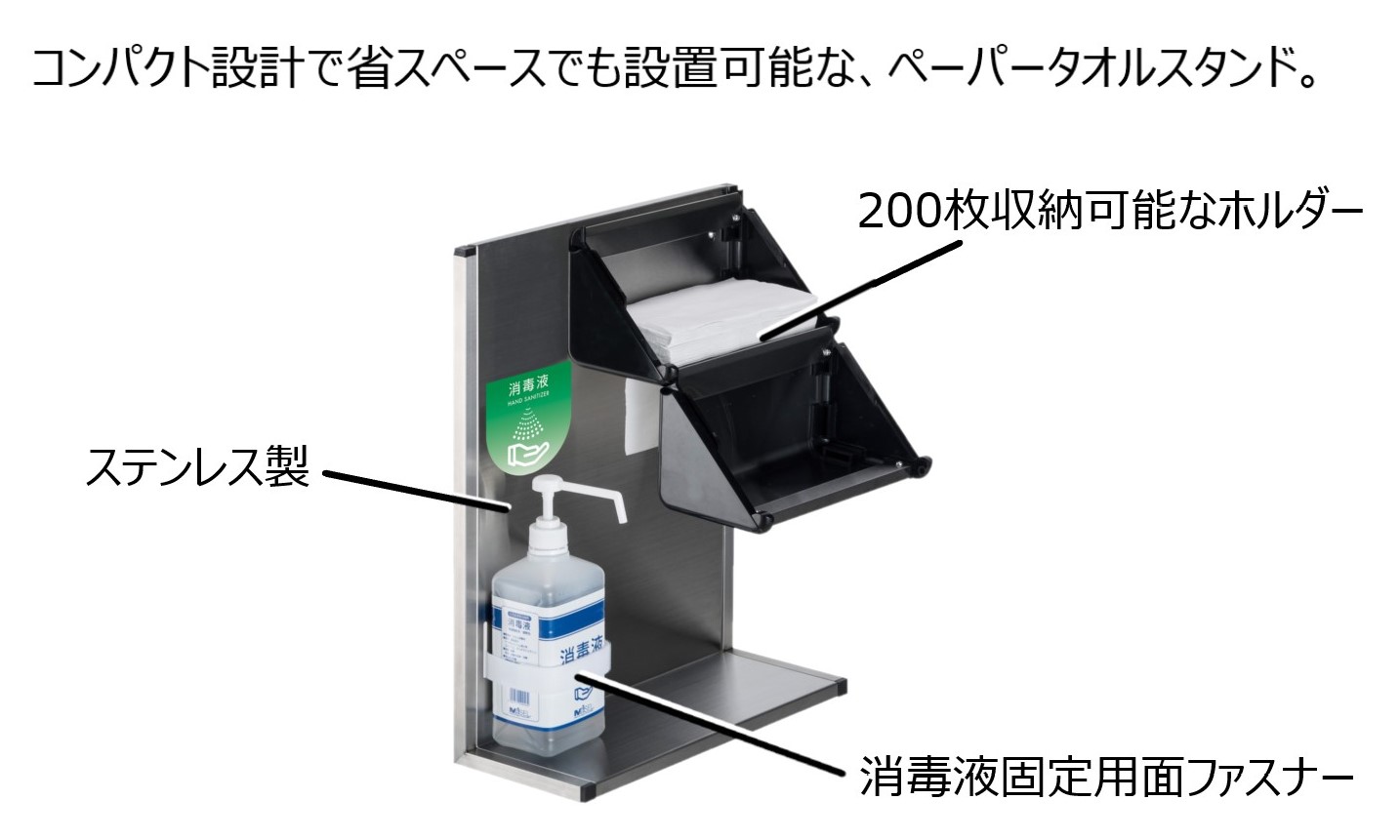 スタンドは清潔感のあるステンレス製で汚れもサッと拭き取れます。消毒液固定用バンドがついており、面ファスナーで様々な消毒容器に対応します。また、ペーパータオルホルダーは、ペーパータオル約200枚を収納することができます。