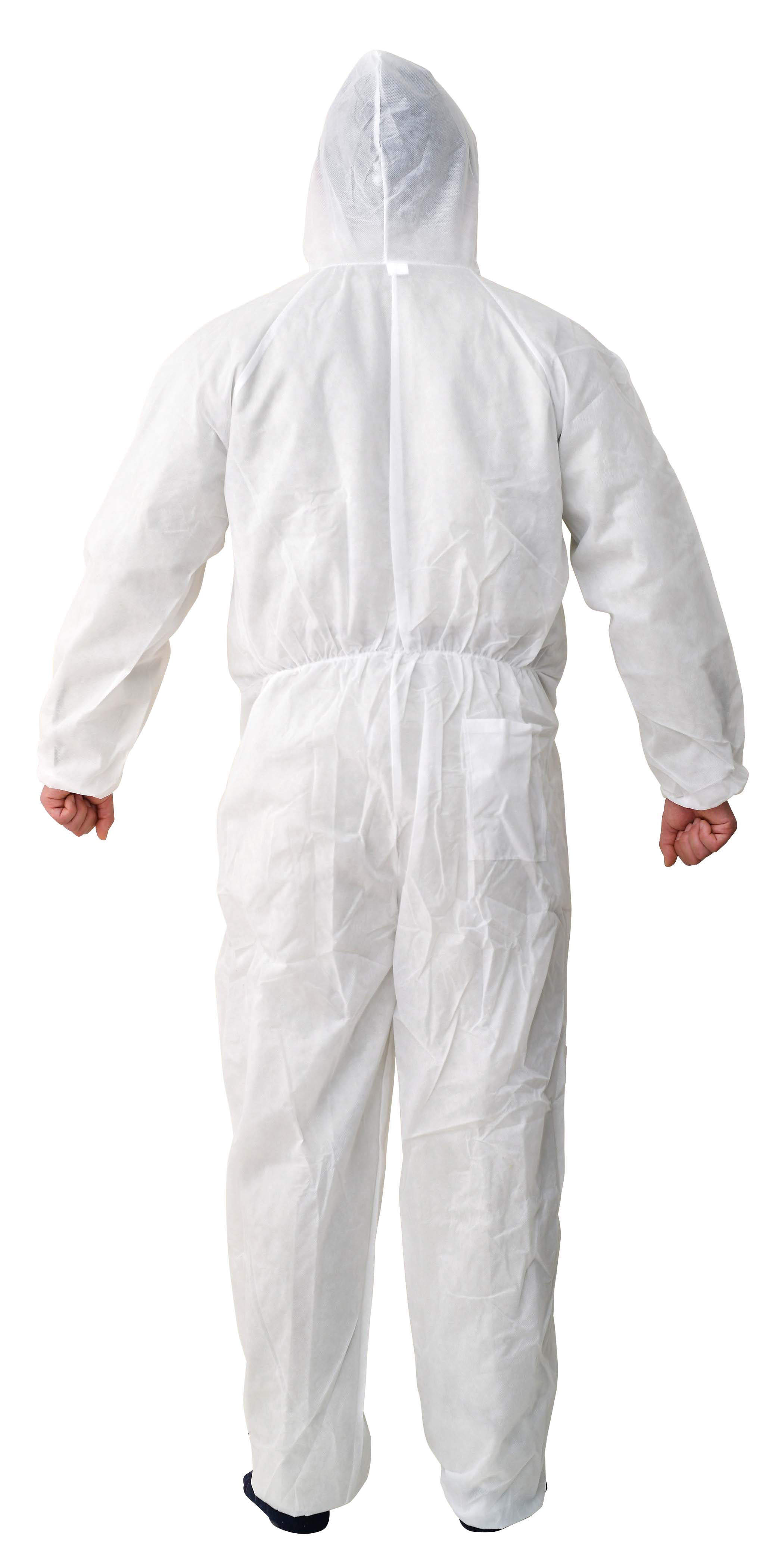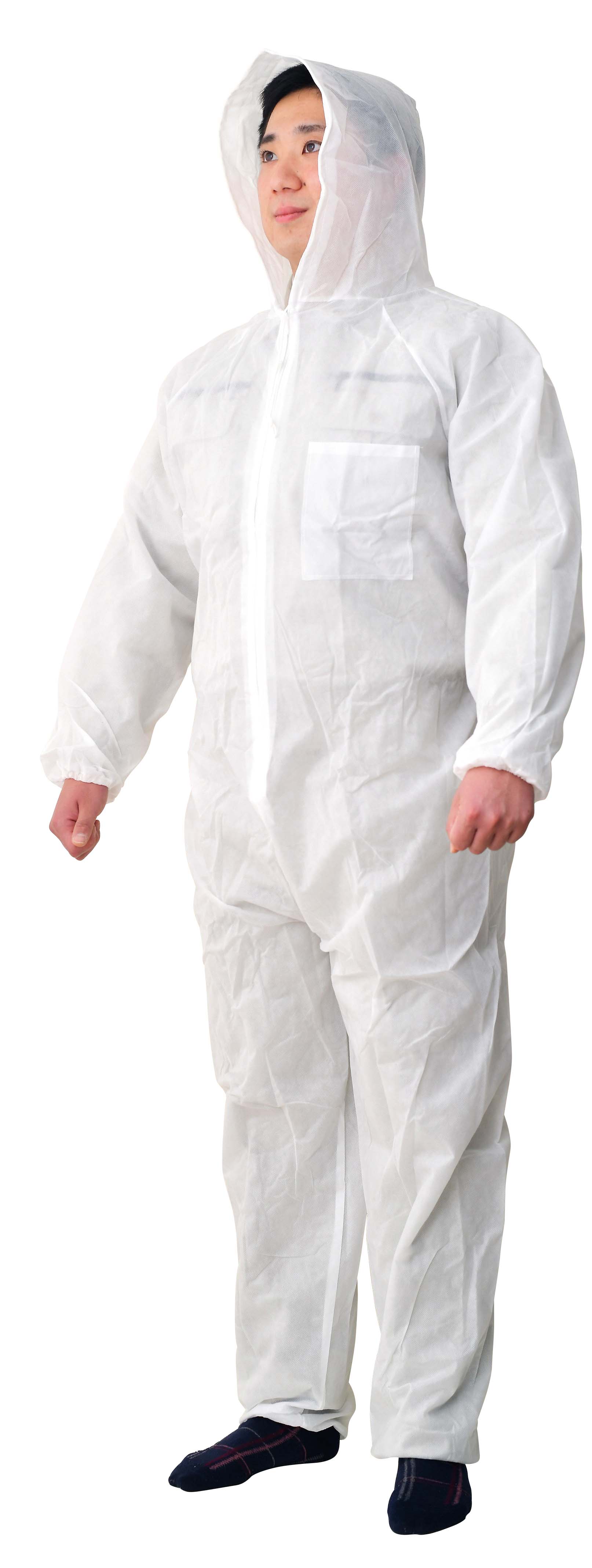 使い捨てつなぎ服【着たろう】 フード・ポケット付のつなぎ服です。 通気性がよく、軽く、ムレにくいです。