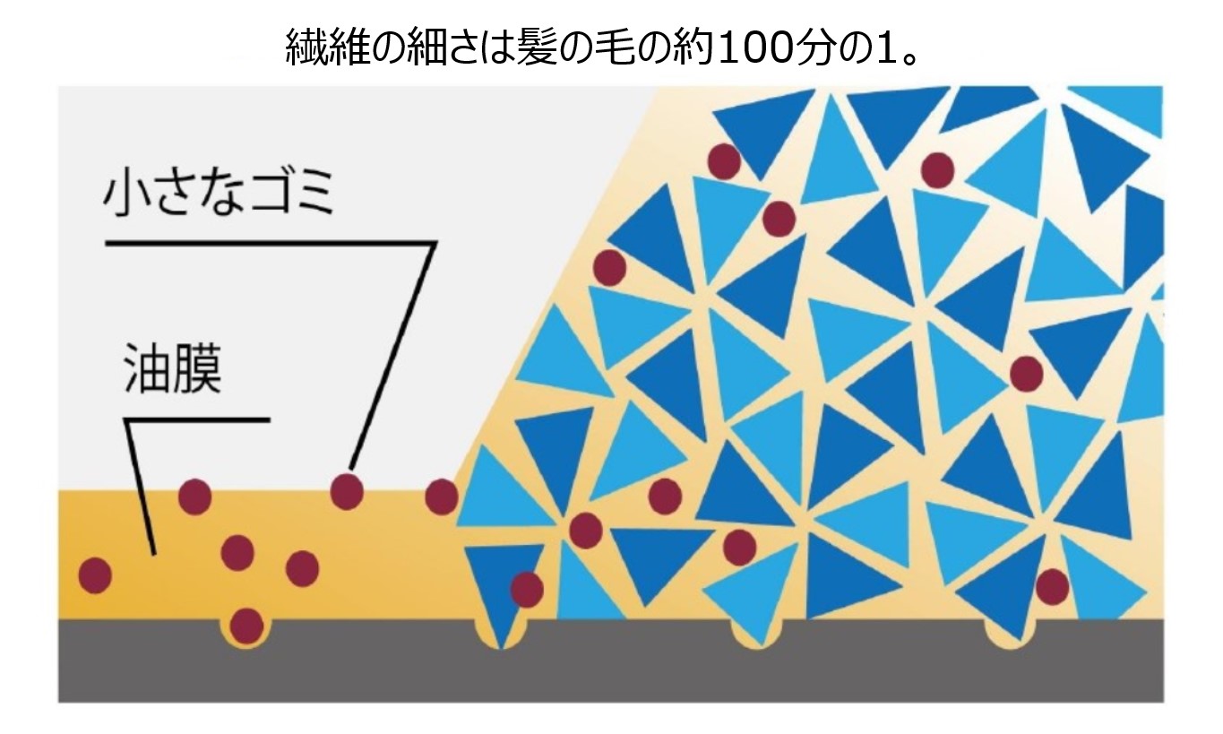 • シャープなエッジを持つ超極細繊維が目に見えない凸凹に入り込み、ミクロン単位の汚れやホコリも拭き取ります。超極細繊維の毛細血管現象により吸水力も抜群です。