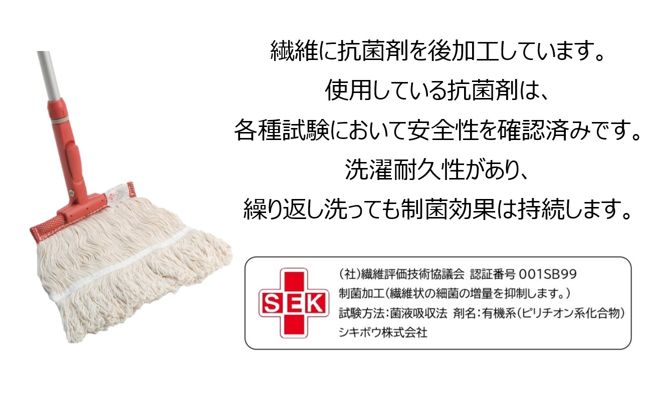 • 制菌加工糸を使用し、衛生効果が高く病院などにも最適なメッシュタイプのモップ糸です。(社)繊維評価技術協議会 認証番号001SB99 制菌加工(繊維上の細菌の増殖を抑制します。)試験方法:菌液吸収法 剤名:有機系(ビリチオン系化合物)