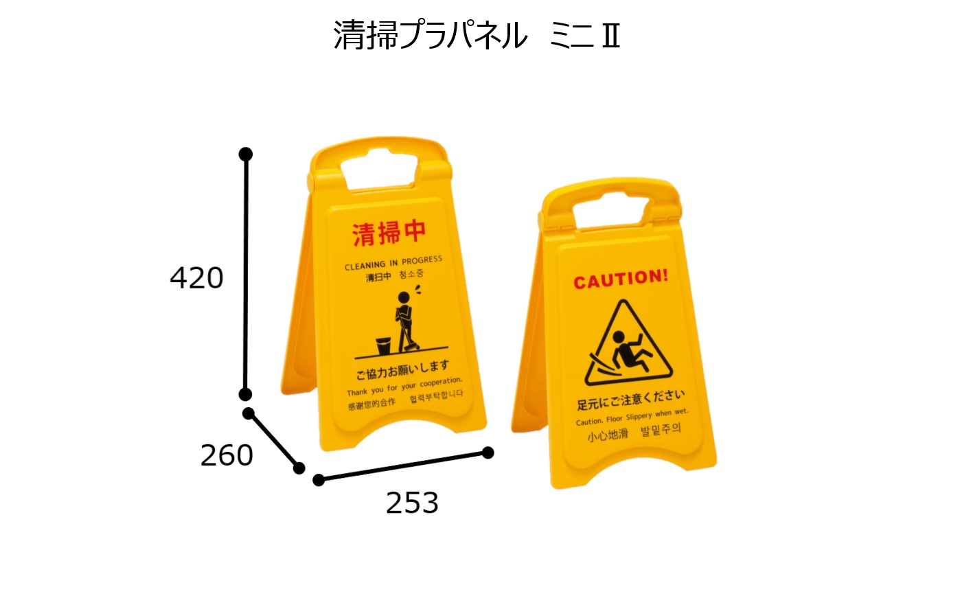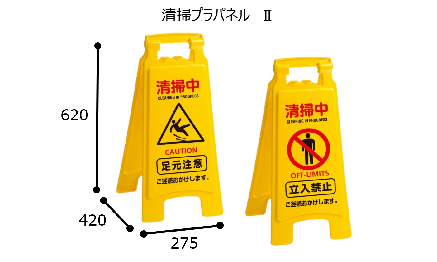 ひと目で清掃中とわかるデザインの清掃案内パネルです。折りたたみ式で折りたたんだ際の厚みは約4cmと保管に場所を取りません。