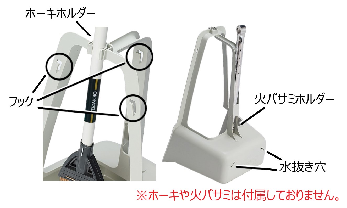 チリトリには∅16~19mmまでのホーキがセットが可能です。袋などを掛けられるフック(3ヶ所)がついており、背面にあるホルダーに火バサミも収納できます。
