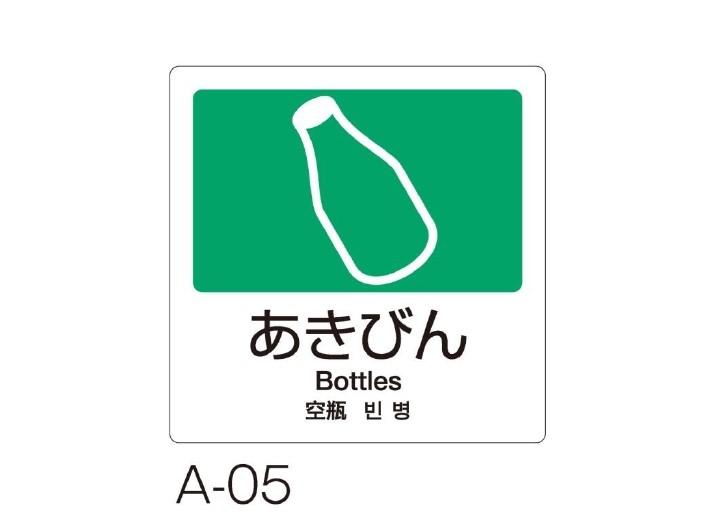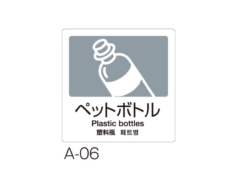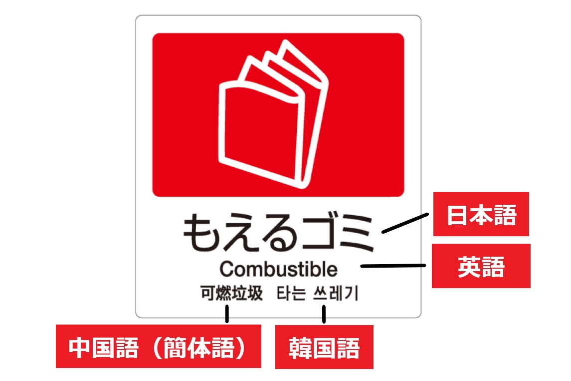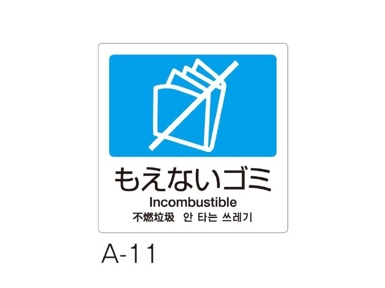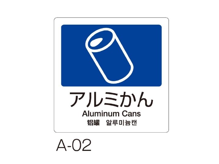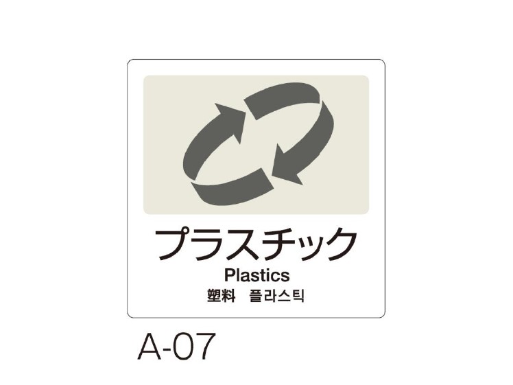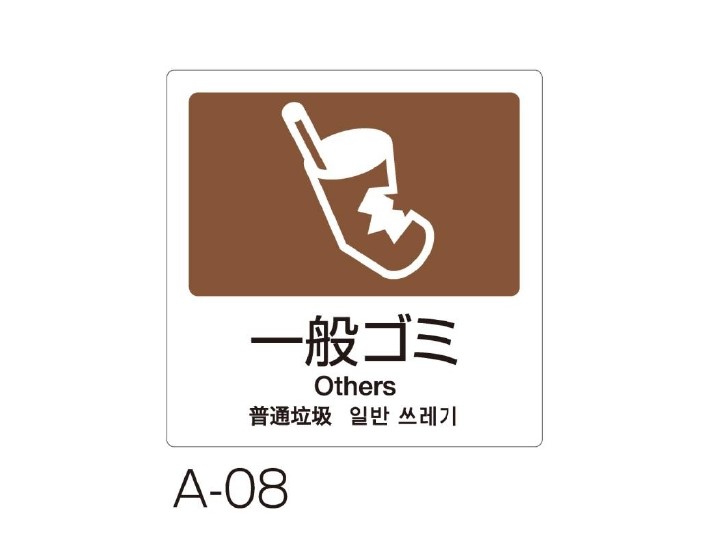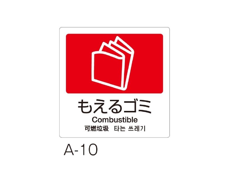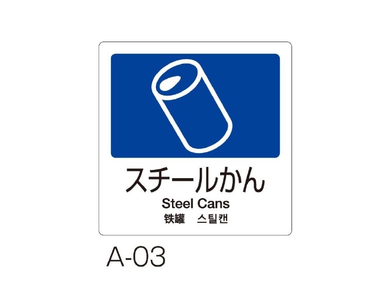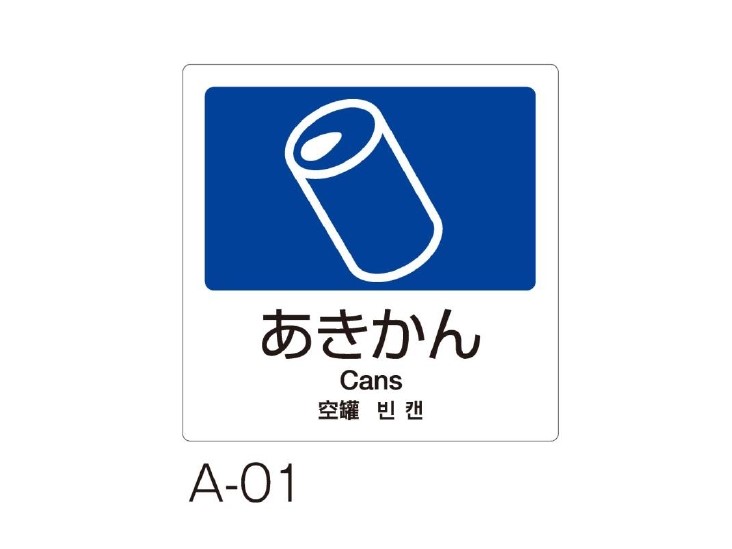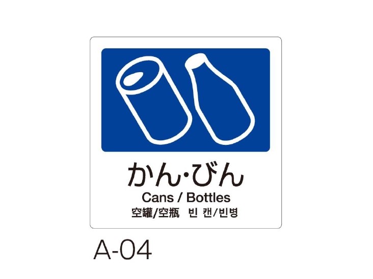 汚れにくいラミネート加工で屋内外で使用できる。4ヵ国語表記の分別ラベル。