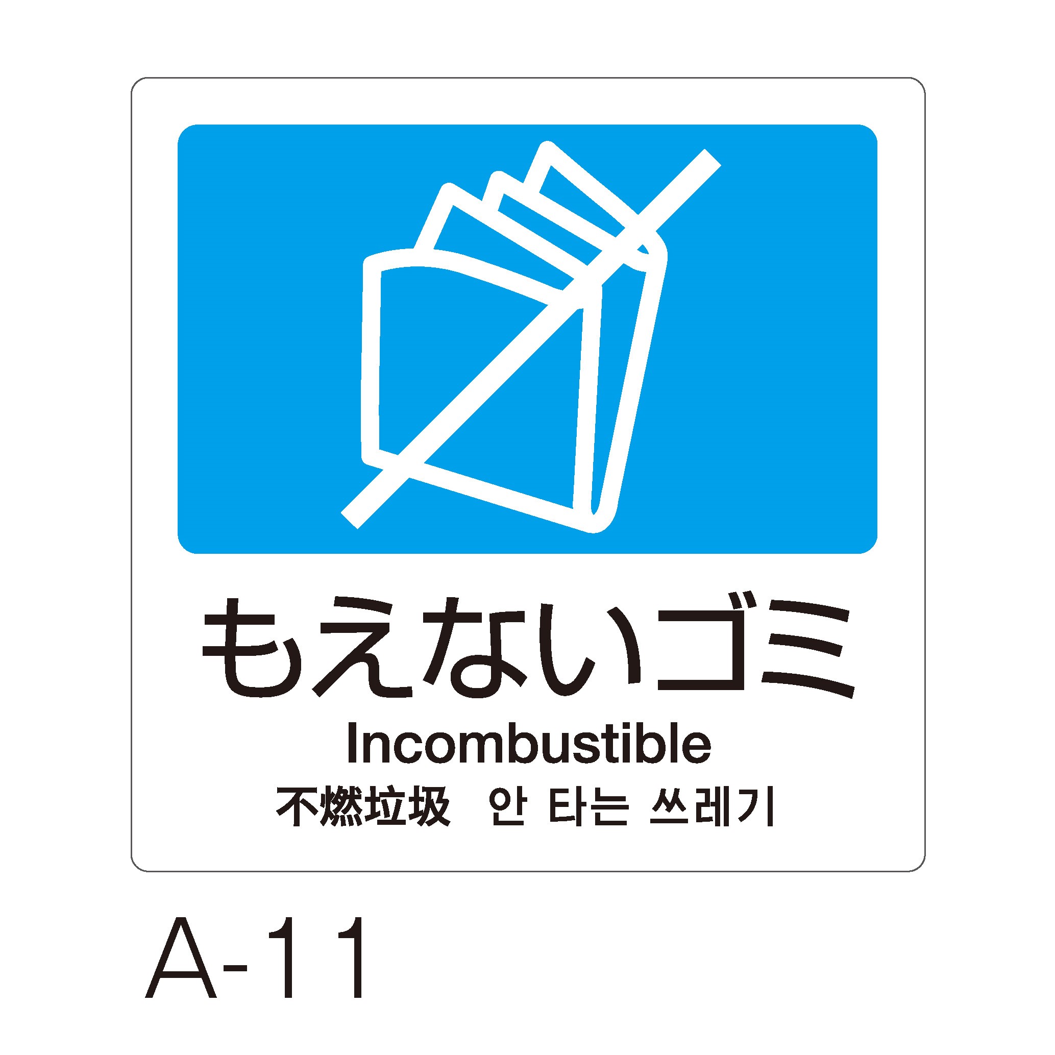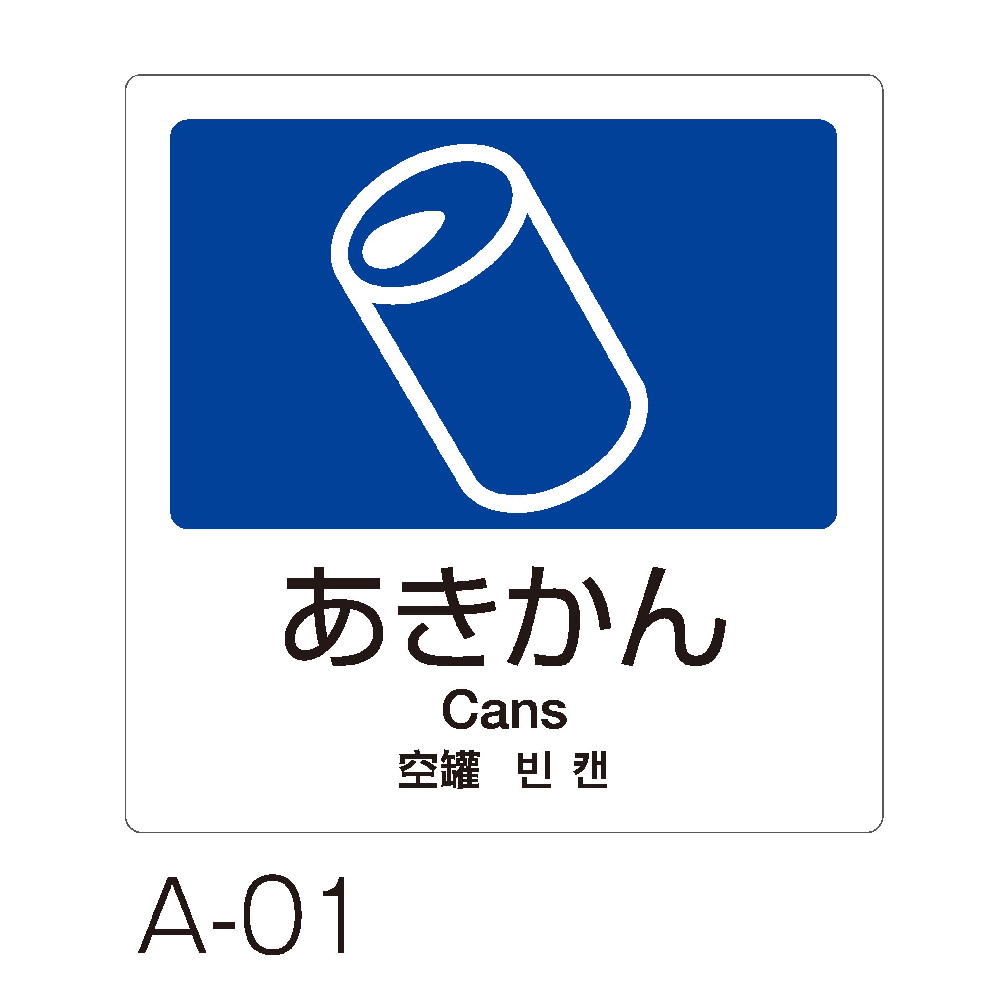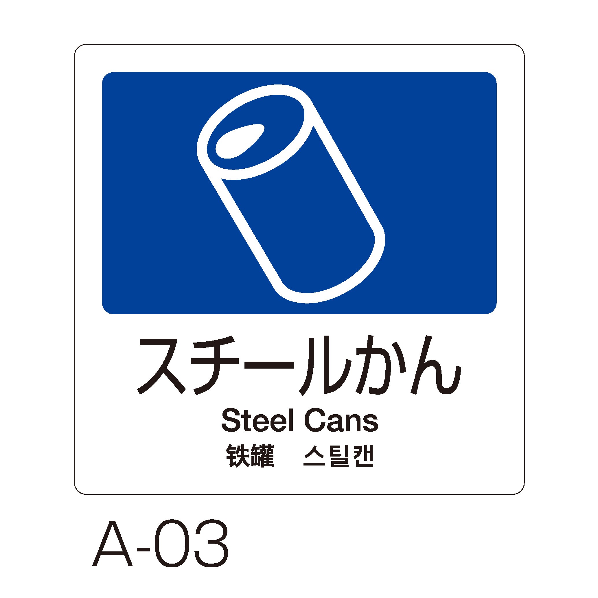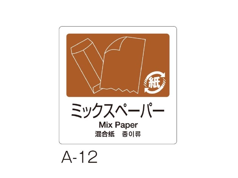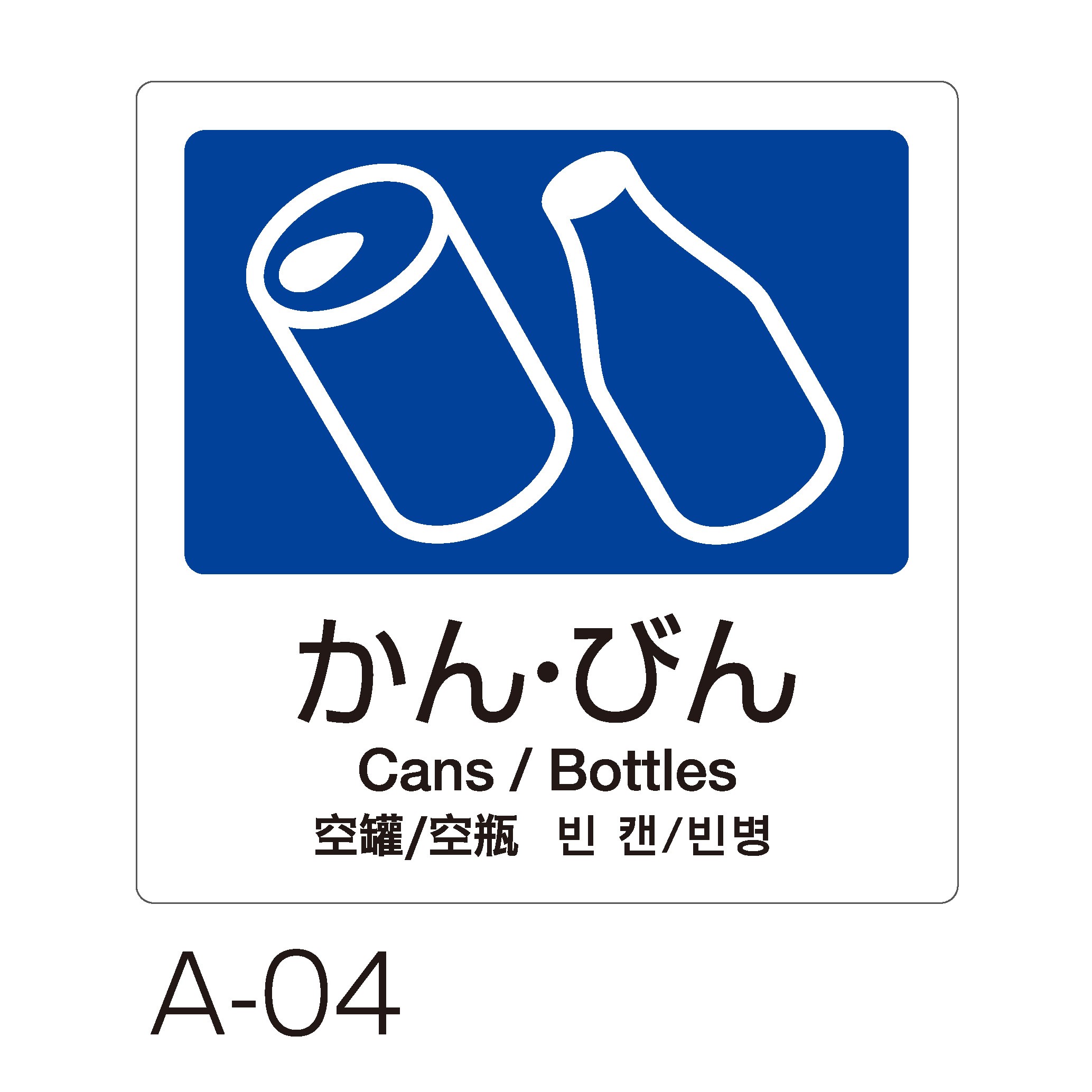 汚れにくいラミネート加工で屋内外で使用できる。4ヵ国語表記の分別ラベル。